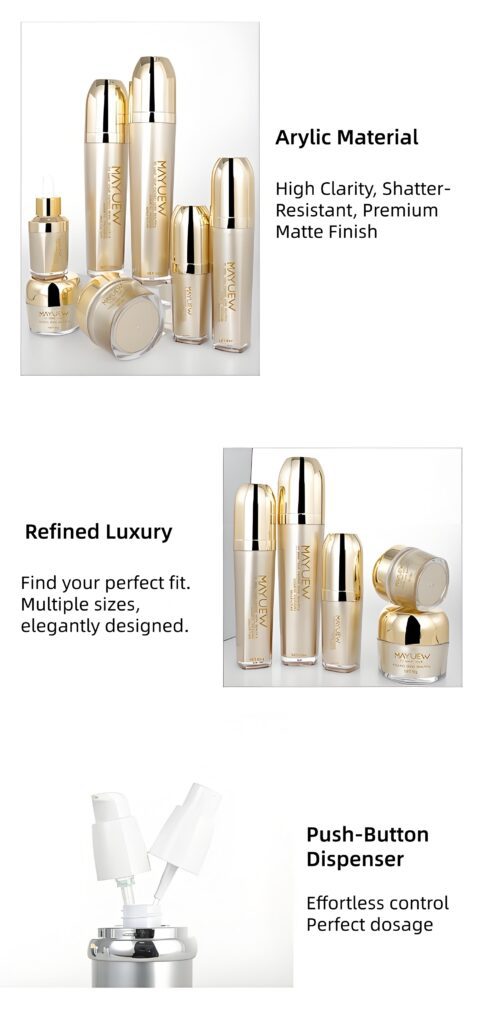 • SEO Focus: Luxury cosmetic packaging, gold acrylic bottles, complete bottle set, custom jars.